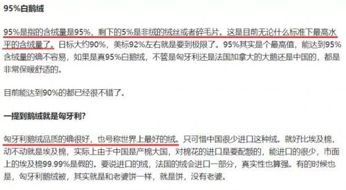 含绒量95%是目前纺织品最高含绒量,指的是>95%都是完整的绒朵,剩下<5%是碎绒丝,已经是填充技术的极限了。匈牙利白鹅绒更是号称世界上最好的绒。