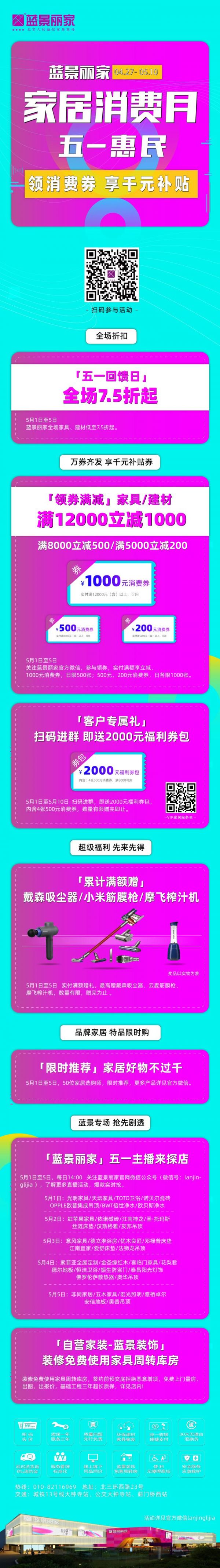 4月27日至5月5日,扫码进入蓝景丽家“VIP家居服务星”微信群,即送2000元顾客福利券包(内含4张500元消费券),限量100套。