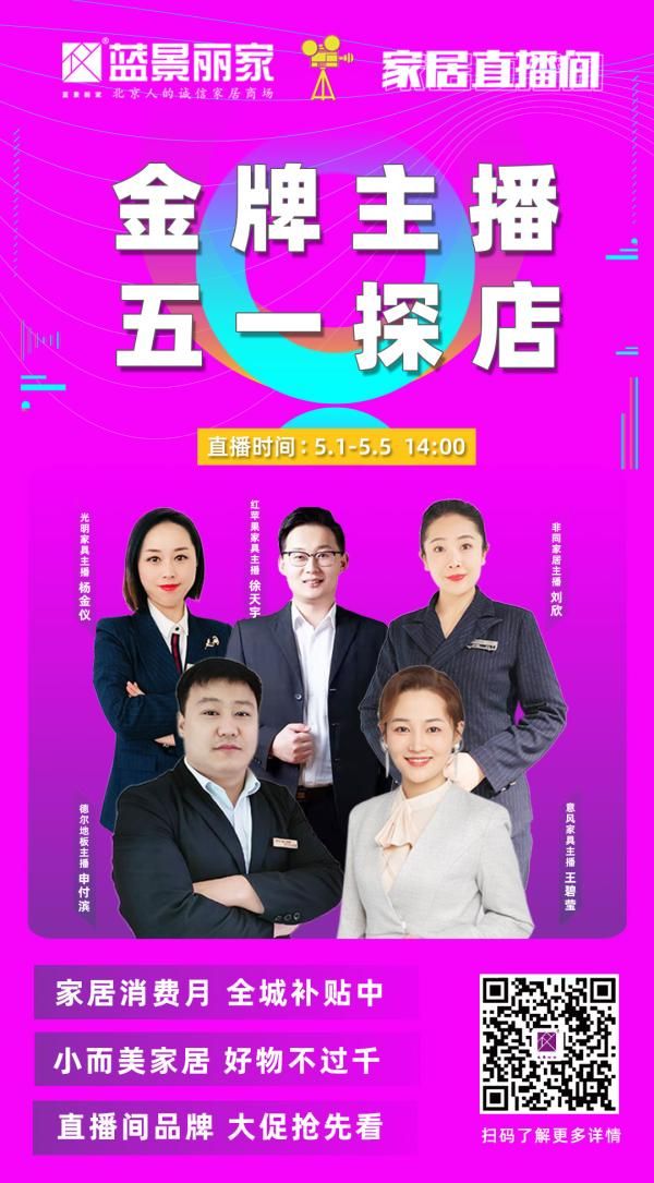 5月1日至5日,每日14:00,蓝景丽家金牌主播带您五一探店,寻找小巧精致的千元内家居好物;更多直播预告,请关注蓝景丽家官网微信公众号(微信号:lanjinglijia ),在导航栏家居好物中,点击家居直播间,了解更多直播活动,及选购攻略。