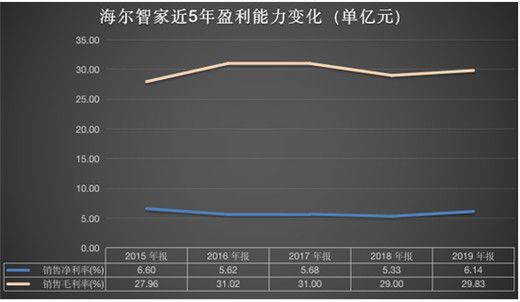 在研发投入方面,海尔智家研发费用连续三年加大投入,2017-2019年分别为45.89亿元、53.98亿元和67.11亿元。在盈利能力方面连续三年稳增长,2017-2019年,销售毛利率分别为31%、29%、29.83;销售净利率分别为5.68%、5.33%和6.14%。