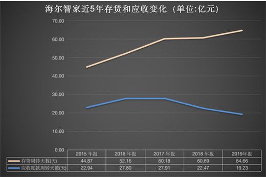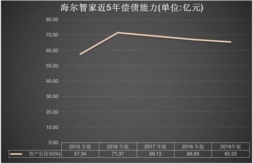 在现金流方面,2019年海尔智家经营活动产生的现金流量净额为150.83亿元,期末现金余额349.63亿元,资产负债率连续三年下降,2017-2019年分别为69.13%、66.93%和65.33%。