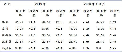 一方面,海尔智家对空调产业进行了产品、品牌和渠道层面的调整。产品层面,提前储备健康除菌类产品和新能效布局,此外加大高端产品布局;品牌层面,围绕健康主线,主推健康空气场景方案;渠道层面,发力线上渠道,快速海外高端布局等等。经过这一系列调整,2019年Q4开始,海尔空调市场开始回调,2020年Q1调整期的效果初步显现,线上线下份额提升明显,份额已经从去年的12.2%提升至16%。
