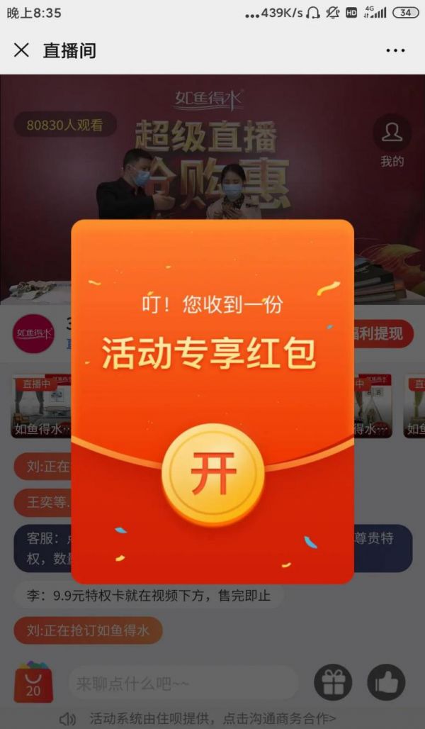 可以看到,疫情期间消费者的消费行为发生了变化,直播卖货成为了备受追捧的消费渠道。如鱼得水顺势而为,举行了多场线上直播抢购会。仅3月20日单天,如鱼得水的直播间累计在线观看人数高达80000+,在短短2小时的直播之间内,共成交了2157单!显然,这次全民推广式营销的尝试,如鱼得水成绩斐然。直播过程中,如鱼得水也与用户建立了良性的互动,增强了用户粘性,巩固了品牌忠诚度。