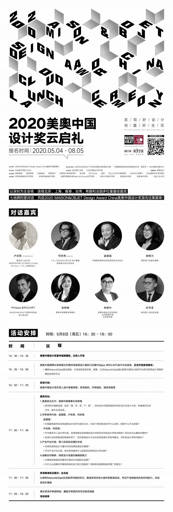 MAISON&OBJET Design Award China美奥中国设计奖理事会将于5月8日在深圳主会场星河第三空间以线上直播云启动的形式,连线北京、上海、香港、台湾、希腊和法国多位重量级嘉宾,七地进行跨时差对话,共启2020 MAISON&OBJET Design Award China美奥中国设计奖报名征集篇章。