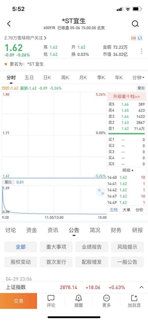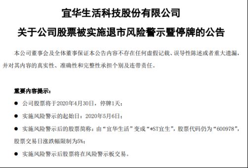 2020年4月30日,宜华生活(600978)停牌1天,“五一”节后自今日(5月6日)开始该公司被实施风险警示,股票简称变更为“*ST宜生”,涨跌幅限制为5%,股票将在风险警示板交易。
