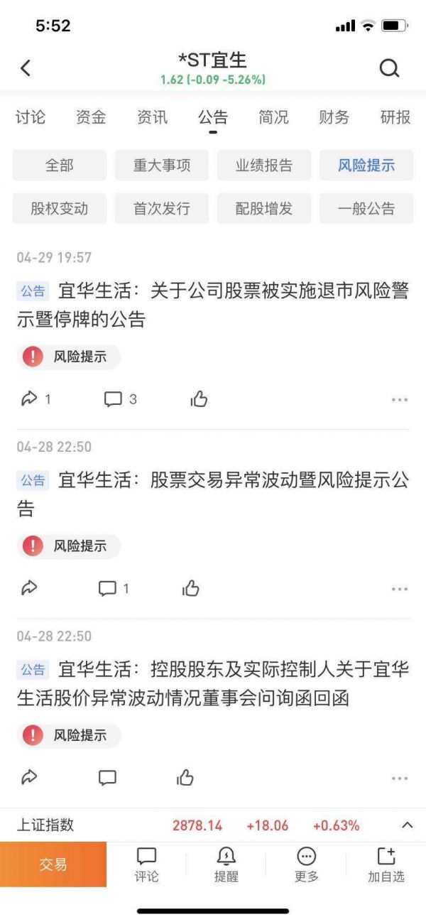 4月26日晚,因涉嫌信披违法违规遭到证监会立案调查,宜华生活因涉嫌信息披露违法违规触及《证券法》被立案调查,同时触发了《上海证券交易所上市公司重大违法强制退市实施办法》规定的重大违法强制退市情形。