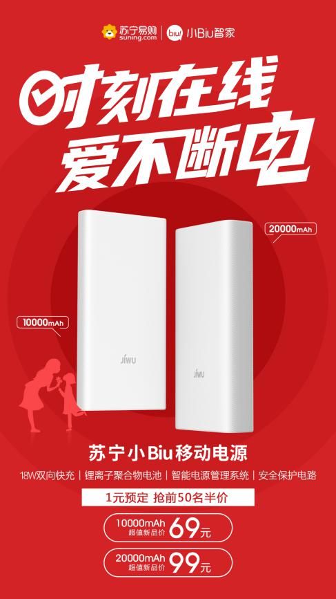拥有小Biu移动电源双向快充版,就能拯救你的“电量恐惧症”,再也不用满世界找充电口!这款新品目前有10000毫安和20000毫安两个规格,10000毫安日常售价89元,新品到手价只要69元;20000毫安日常售价119元,新品优惠价只要99元。5月10日前往苏宁易购官网参加1元预定,15日付尾款就可以拿到这款nice的小Biu移动电源了,让你出门尽情嗨皮,跟手机低电量彻底说拜拜。