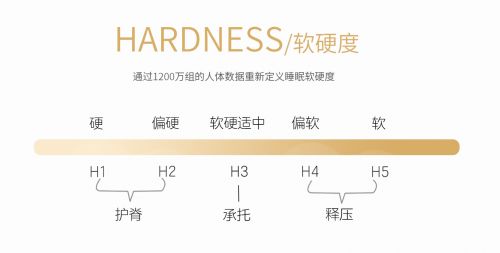 不仅如此,为了更好地区分床垫的软硬度,更精准地匹配床垫的适用人群,KINGSDOWN金斯当Mebane 1904系列新品还引进全新的Hardness软硬度体系,将床垫软硬度分为五个级别:H1(硬)、H2(偏硬)、H3(软硬适中)、H4(偏软)、H5(软),消费者可以根据不同的软硬度喜好与奢华度追求,挑选自己心意的床垫。