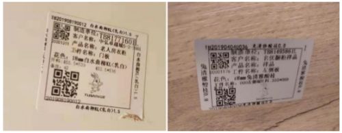 我们的每一块板件上面都有一张小小的标签,这是我们纬纶治木软件所生成的防伪二维码标,这张二维码里面保存了这块板件的尺寸大小,颜色以及孔位图,相当于每块板件的身份证。