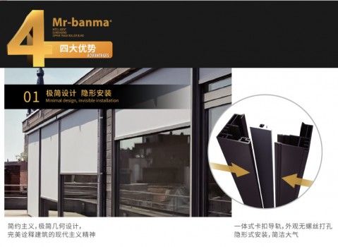 作为一个专注于遮阳行业的品牌,斑马先生联合了国内知名的面料生产商山东玉马联合研发,将两种结构的防风卷帘进行了重整研发,将两种结构的优点进行了结构性的系统整合,推出了一款全新的户外防风卷帘产品——封闭一体式导轨防风卷帘。