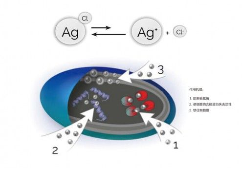生活中大部分病菌都是通过蛋白酶来维持新陈代谢,带正电荷的Ag+可以强烈地吸引细菌体中蛋白酶上的巯基(-SH),迅速与其结合在一起,使蛋白酶丧失活性,导致细菌死亡。当细菌被Ag+杀后,Ag+又由细菌尸体中游离出来,再与其它菌落接触,周而复始地进行上述过程,所以银离子杀菌是有持久性的。