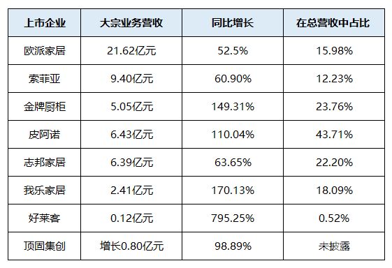 在9家定制家居上市公司中,尚品宅配没有披露大宗业务的相关数据,网易家居以另外8家企业的大宗业务业绩进行分析比较。