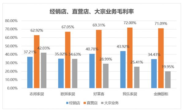 由于地产商和装修公司处在流量入口上游,且能够批量采购,家居企业在与地产商、装修公司合作时议价能力尚为有限,除欧派家居和志邦家居以外,其他主要上市公司大宗业务毛利率普遍低于直营和经销毛利率水平。