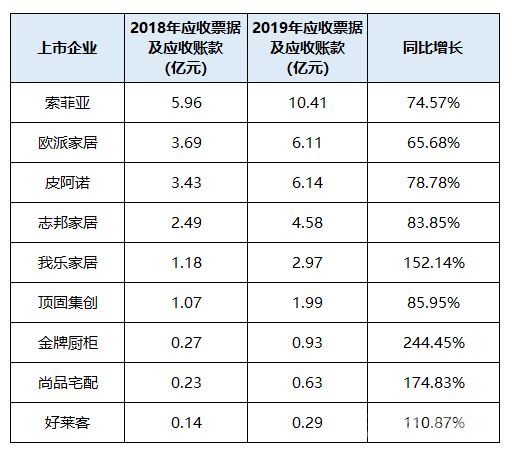 索菲亚2019年应收票据及应收账款达到10.41亿元,增长74.57%,其中,应收账款6.94亿,应收票据3.47亿元。欧派家居2019年应收票据及应收账款3.69亿元,增长了65.68%。究其原因,主要都是期末应收大宗用户业务项目款增加所致。