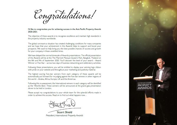 该奖项分为亚太地区,加拿大,欧洲,英国和美国等。国际房地产大奖(亚太区)是所有地区中最大,最负盛名且得到广泛认可的赛区。本届独立评审团由80多位行业专家组成,从设计,质量,服务,创新,独创性以及可持续性等多方面对作品进行评选。能够获得此份奖项殊荣,也证明了设计作品及团队在国际设计领域得到了极大的认可和鼓励。颁奖典礼将于今年9月在曼谷举行,敬请期待!