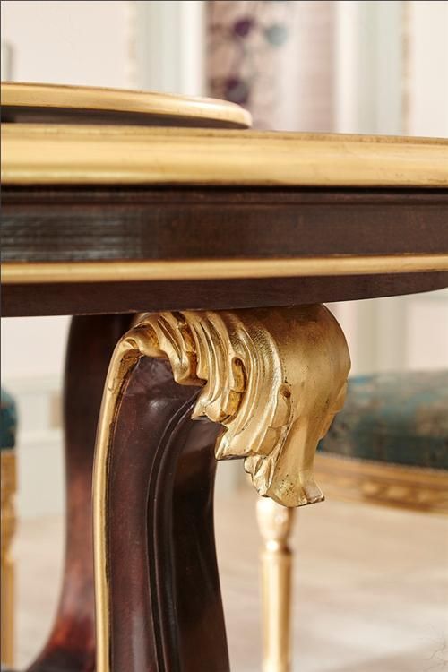 FR005餐厅,宛若一幅油画,清水蓝印象派风格的餐椅,搭配高级黑金圆盘餐桌,呈现优雅的欧式魅力,细节处处体现Frandiss精湛的雕刻工艺,餐桌脚是动态感十足的狮爪造型,餐椅则是精致的罗马柱造型,蕴含尊贵典雅的温润气质。