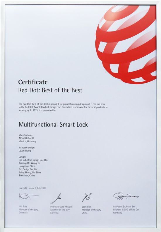 去年王力德国研发中心设计了一款智能锁,表面看像一个哑铃,光滑平整,小巧精致,造型充满科技感。两头侧面轻轻一触,电子屏亮起,显示数字符号,可以密码开锁;两头上方再轻轻一触,“叮”的一声,则可以指纹开锁。这种用精益求精的工匠精神研发出来的智能锁,不管是质量还是颜值都令人惊叹。因此,这款能智能锁去年荣膺德国红点至尊奖。今年2月又凭借突出的产品设计和创新,问鼎德国iF设计大奖。