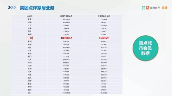 给大家先看一组数据,这是美团&大众点评23个重点城市的会员数据,从数据上面可以看得到,点评的活跃用户重点还是集中在头部的一线城市和新一线城市,像北、上、广、深、杭,包括成都、天津、重庆,日活用户数是很高的。