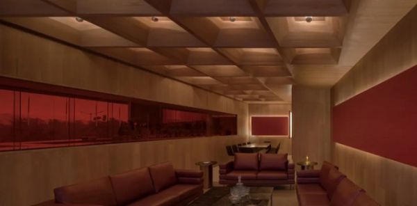 以“红”跟木色为主带着少许金属色的搭配无处不彰显着沉稳的高级感,红色的语言从玻璃材料延续到墙面的画作,同时也让房内外的互动变得更加地有趣。天花板的设计语言除了美感的体现外,同时在功能上起到了降噪的功能,这也是他们曾经在老师那里学会的重要一课:始终将功能、实用性以及创意糅合在一起。