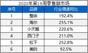 具体来看,海尔零售额增速同比提高255.1%;小天鹅同比提高220.6%;西门子同比提高211.0%;松下同比提高252.8%;美的同比提高92.5%。