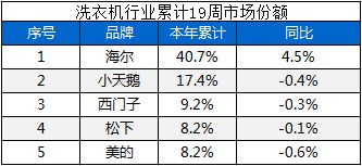 从累计19周数据来看,海尔、小天鹅等头部品牌较为集中,其中,海尔占40.7%,同比增长4.5%;小天鹅占17.4%,同比下降0.4%;西门子占9.2%,同比下降0.3%;松下占8.2%,同比下降0.1%;美的占8.2%,同比下降0.6%。