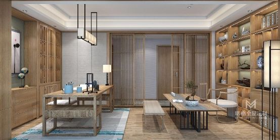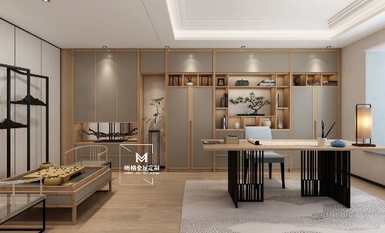 玛格新中式风的书房,在色彩搭配上就十分讲究和谐。带灰度的墙面,搭配原木色的书柜,素雅而有格调,符合大家对书房的环境要求。而湖蓝色地毯的装饰,则为空间注入一丝活力。
