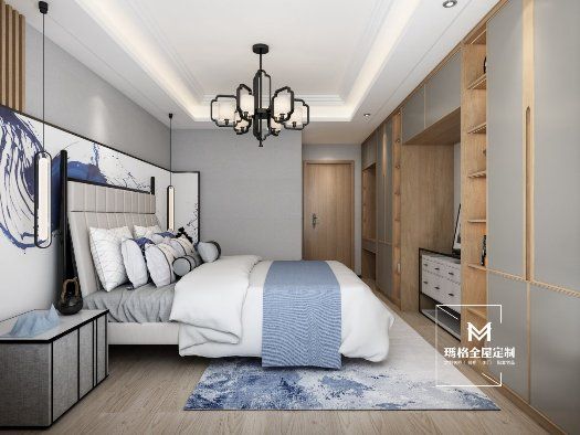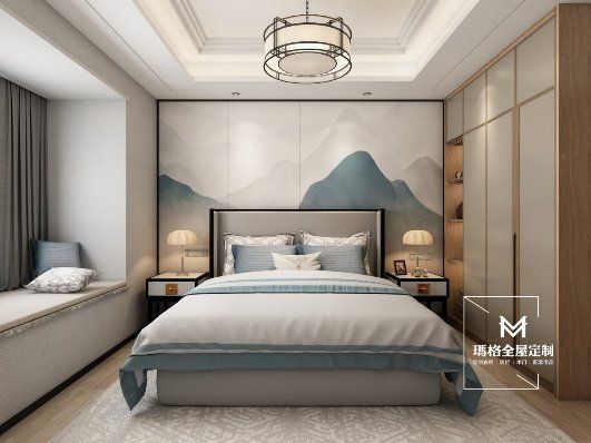 玛格新中式风主卧,无论在色彩、设计、家具摆放等方面,除了完美继承了中式传统风格的精髓,还处处展示着“新”。