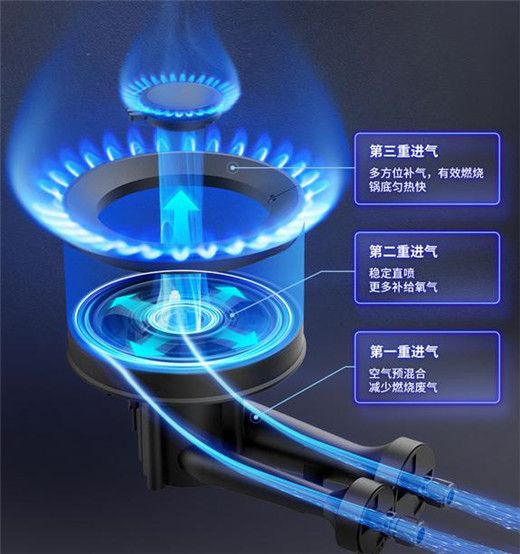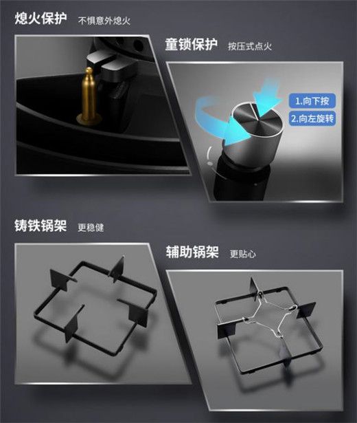以名气燃气灶B326A为例,它采用三重安全防护。首先是熄火保护装置,意外熄火时电磁阀会立即闭合,从而达到熄火保护的目的。其次是“童锁保护”,贴心的童锁保护可以自动锁定灶具功能键位,防止儿童意外点燃灶具,安全贴心。最后则是新型铸铁锅架,造型更厚重,支撑更牢固,避免了传统燃气灶锅架支撑不稳导致炒锅掉落的危险。二、性能指标是关键选择燃气灶品牌时,性能指标——热负荷(火力)堪称是核心指标。这个数据决定燃气灶能够输出的热量,中式烹饪讲求大火爆炒,目前普通燃气灶的热负荷一般是3.8KW或4.0KW,火力表现算是中规中矩。