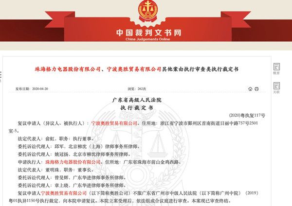 5月11日,中国裁判文书网资料显示,广东省高级人民法院于2019年8月30日作出(2018)粤民终1132号二审判决,维持广州知识产权法院一审原判,认定宁波奥胜贸易有限公司(原宁波奥克斯空调有限公司)恶意侵权成立,判决后者向珠海格力电器股份有限公司赔偿4000万元。