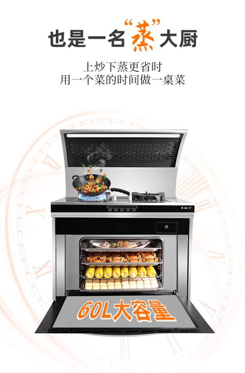 平时可以上炒下蒸,蒸箱更有60L大内腔,能节省做饭时间。并且蒸可大程度上保留食物原有的蛋白质、纤维素等营养成分,口感新鲜质朴、原汁原味,更利于消化吸收和身体健康。