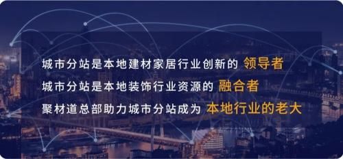 “聚材道”实行总部和城市分站一体化运作。总部提供全国性资源和系统工具的支持,城市分站融合当地资源、落地服务。一城一站,共创共享共赢。