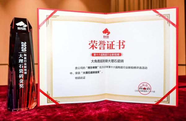 中国陶瓷行业新锐榜是我国覆盖面最广、影响力最大、最权威的陶瓷行业评选活动,标志着我国陶瓷行业最高发展水平,被誉为中国陶瓷行业的“奥斯卡”,本届新锐榜汇聚了东鹏、蒙娜丽莎、诺贝尔等国内数百家陶企同台竞技。能获此殊荣,充分证明了行业对大角鹿超耐磨大理石瓷砖的肯定。