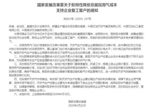 今年2月,为支持企业复工复产,国家发展改革委发布通知,阶段性降低非居民用气成本。通知决定,在现行天然气价格机制框架内,提前实行淡季价格政策,尽可能降低企业用气成本。但措施有效期截止至2020年6月30日。