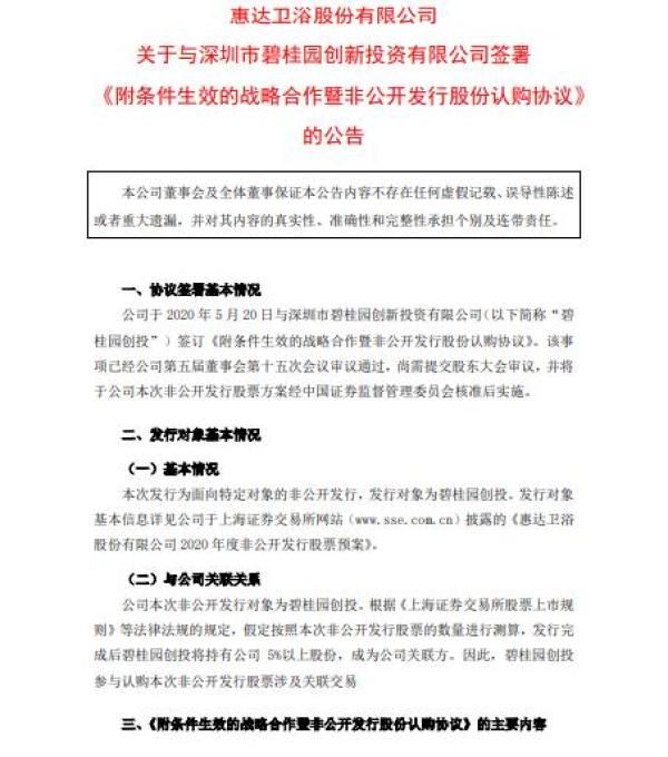 新浪家居讯 5月20日,惠达卫浴股份有限公司关于与深圳市碧桂园创投签署《附条件生效的战略合作暨非公开发行股份认购协议》的公告。公告称,碧桂园创投通过认购惠达卫浴本次非公开发行的股票,认购完成后,持惠达卫浴 5%以上的股份,同时拟委派 1 名董事参与甲方的公司治理。