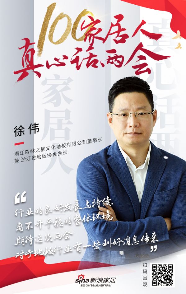 浙江森林之星文化地板有限公司董事长兼浙江省地板协会会长徐伟:“行业的良好发展与持续,离不开平稳的整体环境,期待这次两会对于地板行业有一些利好消息传来。”