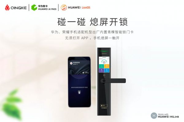 青稞智能锁与HUAWEI AI PASS(华为智卡)、HUAWEI HiLink、HUAWEI LiteOS等技术深度融合,打造出首款同时支持华为手机熄屏开锁,和华为智能家居联动的产品。