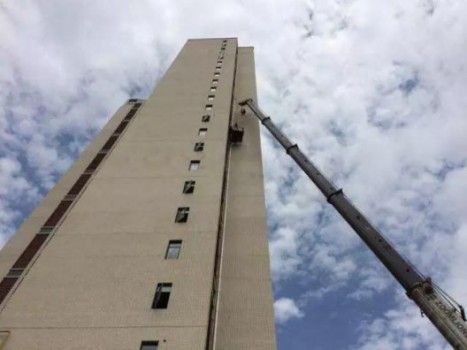 因为楼房设计问题,江西省定南县郭先生家的空调无法正常安装,两位工程师不得不被大吊车吊到40米高空进行空调安装。