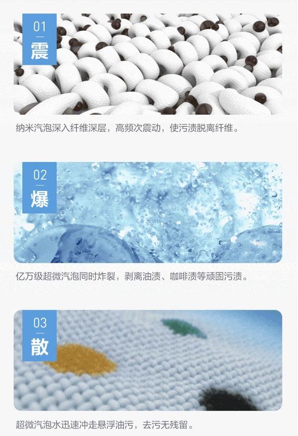 日常生活中衣物清洗主要依靠摔打、搅拌、扭打等物理机械力,以及洗涤剂、柔顺剂等在清洗过程中产生的化学力。但常规的洗衣机由于洗涤桶的转速、角扭力固定等因素的影响,在洁净效果上难以突破瓶颈,而过度添加洗涤剂不仅无助于去污去渍,反而会导致化学残留造成对衣物及人体健康的危害。