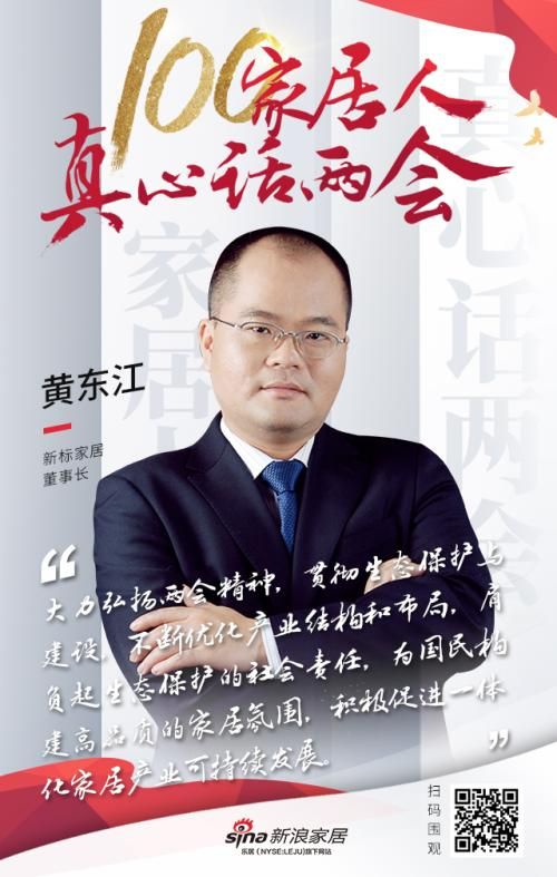 新标家居董事长黄东江:“大力弘扬两会精神,贯彻生态保护与建设,不断优化产业结构和布局,肩负起生态保护的社会责任,为国民构建高品质的家居氛围,积极促进一体化家居产业可持续发展。”