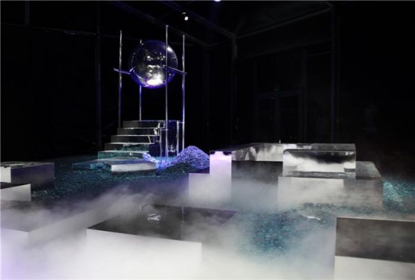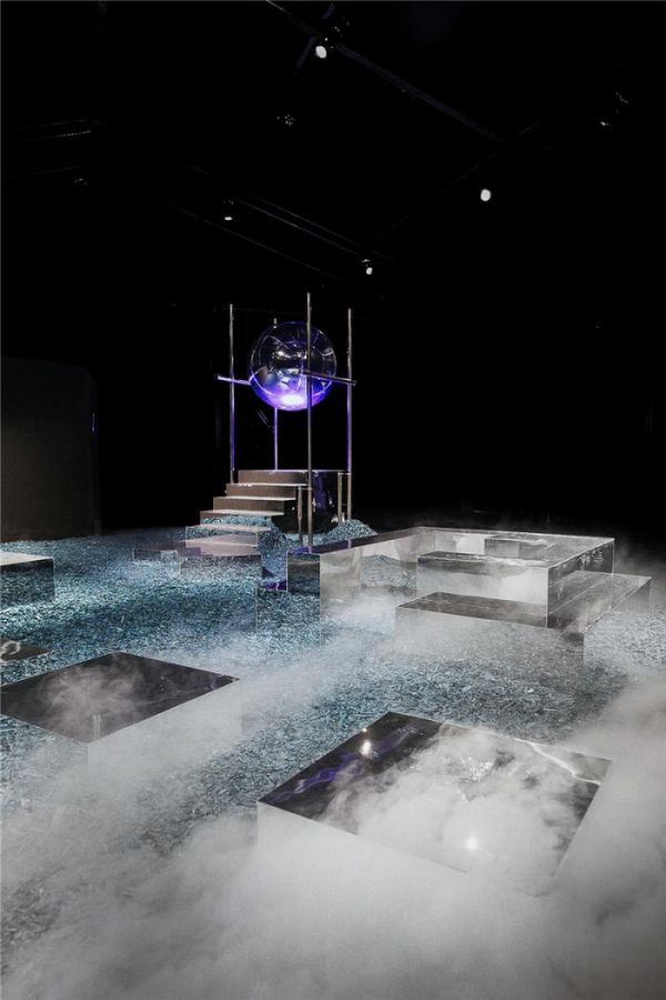 该秀场空间的设计源于对“黄泉国度”幻境的另一种想象,它陌生但并非充满荒凉与恐惧。由此,空间试图呈现一种非常态的意象。阶梯,烟道,球体,无限循环的光体,被一层层的镜面包裹着。被蓝色液体吞吐后的木屑,散落周围,听到游离的魂魄踩过世间的声音。