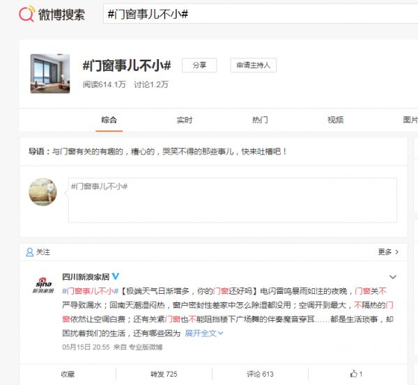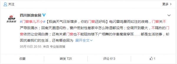 夏天来了,又到了极端天气暴增的时间,高温、暴雨、大风......你家的门窗还好吗?5月18日,四川新浪家居发起#门窗事儿不小#话题讨论,在短短8天时间里,引起了600万的阅读,超1.2万的讨论,日常生活中没有存在感的“小透明”,引起了如此大的关注,门窗果然无小事。