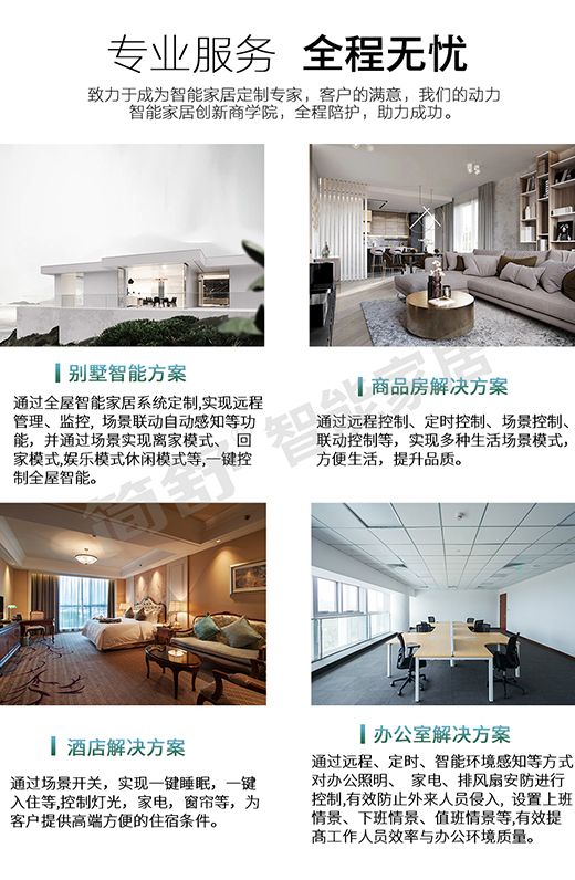 简舒智能家居体验馆全方位为您展示智慧生活该有的样子,有别于市面上其他品牌,以更人性化的设计理念,用心去呵护家庭中每一位成员的家居生活,对于每一位家庭,简舒智能家居都会充分了解他的家庭成员以及生活习惯后,量身定制客户需要的智能化方案,真正的实现人性化、智能化,用心照顾好您的家人。