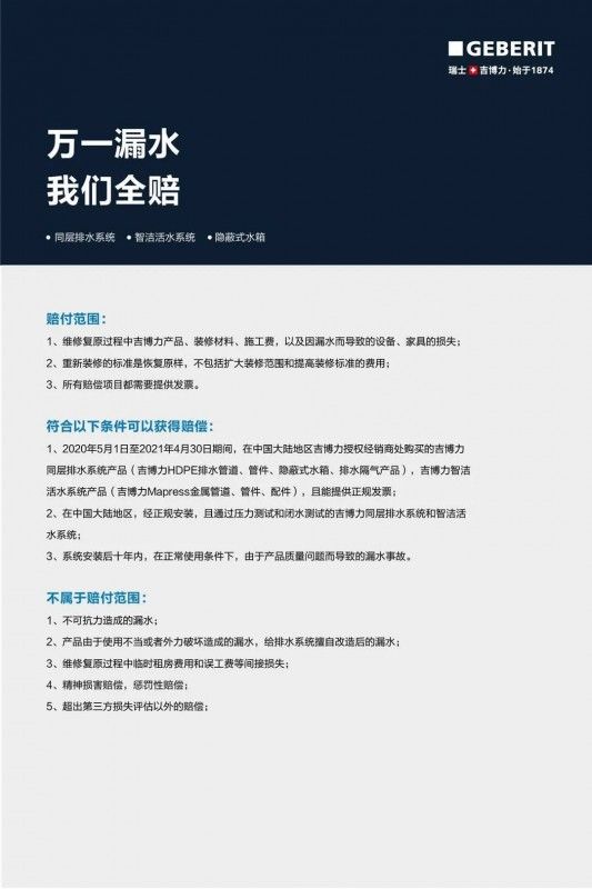 2020年5月1日起, “万一漏水,我们全赔”的活动再次启动,此次赔保的产品从隐蔽式水箱扩大到给排水系统的所有产品。这并不是任何一个国家或行业的标准,只是吉博力公司自发的为免除消费者顾虑提供的一项人性化服务。