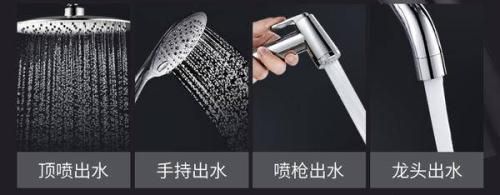 卡贝全铜花洒配置方形四控按钮,方寸间灵敏操控,顶喷、手持、喷枪、龙头四种方式随心调换。