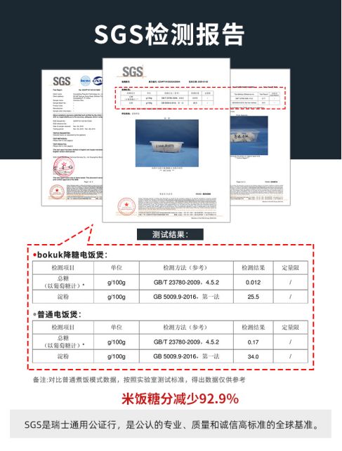 在实现米水分离的过程里,米饭内淀粉和糖类的含量均明显降低。根据全球权威机构SGS检测,与一般的米饭相比,韩国伯可福bokuk脱糖电饭煲煮出来的米饭淀粉含量下降25%,糖含量下降92.9%。