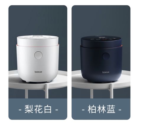 韩国伯可福bokuk脱糖电饭煲共拥有梨花白和柏林蓝两种颜色,风格大气精致,为居家生活带来一种“简约美”。