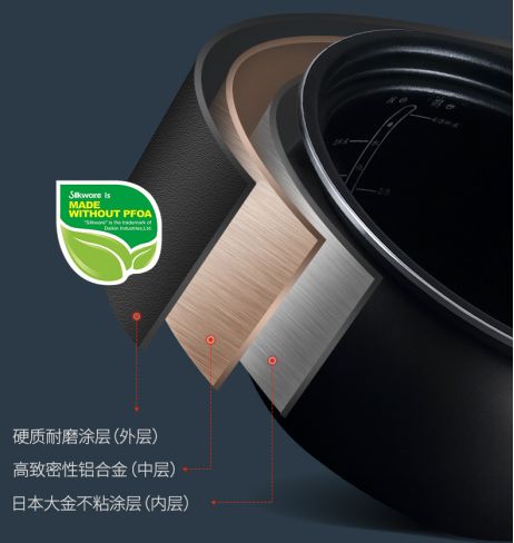 三层内胆从外到内分别是硬质耐磨涂层、高致密性铝合金和日本大金不粘涂层,这种别样的设计让电饭煲具有良好的传热性和不粘性,让米粒在高温蒸煮的过程中受热更加均匀。
