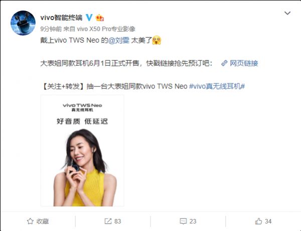 刘雯同款 vivo TWS Neo真无线耳机6月1日开售
