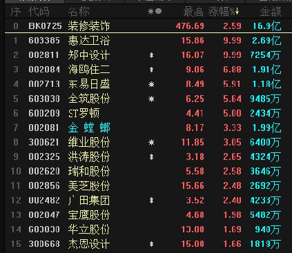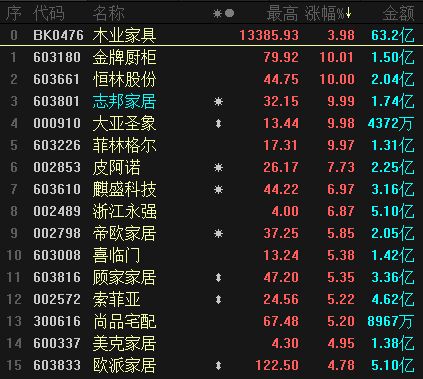 金牌橱柜(柜子)、恒林股份(椅子)、志邦家居(柜子)、大亚圣象(地板)、菲林格尔(地板)、惠达卫浴等多只个股涨停。