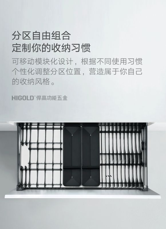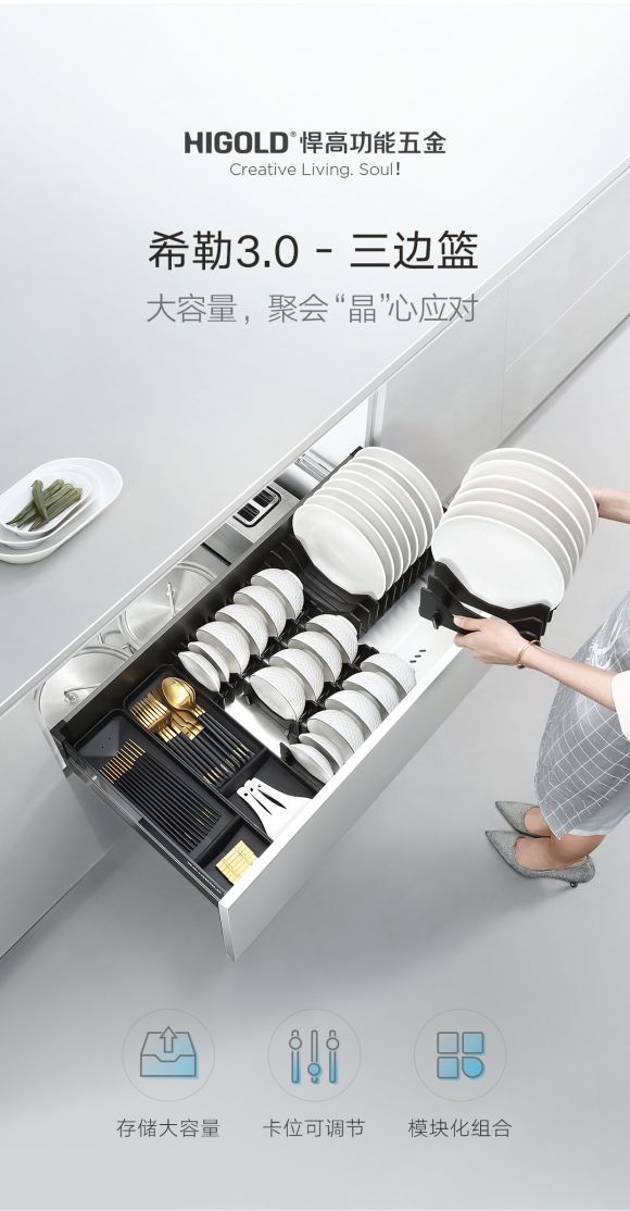 希勒3.0·碗碟三边篮,容量升级、满足家庭聚会、家宴派对等大型用餐需求。三边篮内置的卡位都可调节,轻松应对大小碗碟。900柜体可最大容量36件碗碟,可移动模块化设计,根据不同使用习惯个性化调整分区位置,营造属于你自己的收纳风格。
